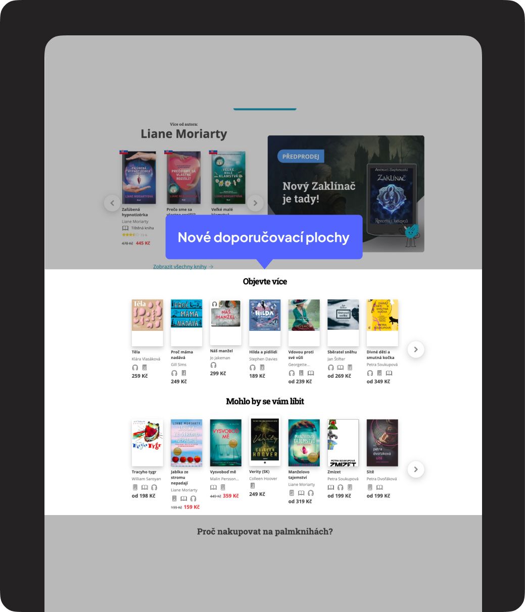 Zoe Deep Recommendations byla nasazena na celkem 6 rekomendačních ploch. Díky pokrytí integračního procesu od A do Z pomocí Zoe mohly Palmknihy rozšířit personalizaci o 3 úplně nové rekomendační plochy, které dosud nebyly využívány.